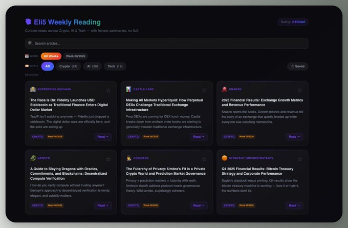 많은 분들이 독서를 번거롭게 느끼실 수 있다는 점을 이해합니다. 그래서 저는 Weekly Bookmark용 Claude Artifact를 만들었는데, 여기에는 다음이 포함됩니다. - 소스 코드에 직접 연결되는 링크를 제공하는 대화형 UI/UX - 각 링크(Chainlink) 에 대한 간략한 요약 - 주요 세 가지 주제(암호화폐, 인공지능, 기타)에 대한 필터 아래 기사에 있는 링크(Chainlink) 자유롭게 살펴보세요. twitter.com/Eli5defi/status/20...