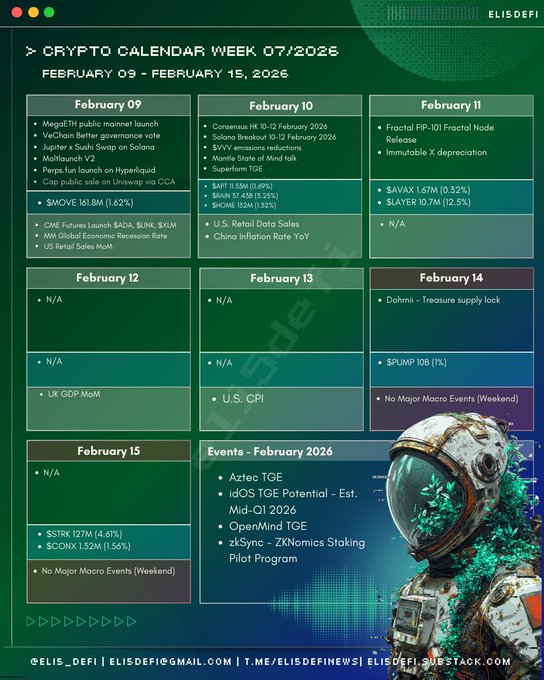 ➥ 암호화폐 캘린더 ../2026주차 ► 2월 9일 이벤트: ▸ @megaeth 공개 메인넷 출시 ▸ @vechainofficial 더 나은 거버넌스 투표 ▸ 솔라나(Solana) 에서 @JupiterExchange와 스시스왑(SushiSwap) ▸ @moltlaunch V2 ▸ @Perpsdotfun이 Hyperliquid에 출시되었습니다 ▸ @capmoney_ CCA를 통한 유니스왑(Uniswap) 공개 판매 잠금 해제: ▸ $MOVE 1억 6180만 (1.62%) 매크로: ▸ CME 선물 거래 시작: $ 에이다(ADA), $ 링크(Chainlink), $XLM ▸ MM 글로벌 경기 침체율 ▸ 미국 소매 판매량 (월별) — — — ► 2월 10일 이벤트: ▸ @consensus_hk 2026년 2월 10일~12일 ▸ @ 솔라나(Solana) 브레이크아웃 2026년 2월 10일~12일 ▸ @AskVenice - $VVV 배출량 감축 ▸ @Mantle_Official 마음가짐에 대한 이야기 ▸ @superformxyz 토큰 생성 이벤트(TGE) 잠금 해제: ▸ $APT 1133만 (0.69%) ▸ $RAIN 374.3B (3.25%) ▸ $HOME 1억 3200만 (1.32%) 매크로: ▸ 미국 소매 판매 데이터 ▸ 중국 전년 대비 인플레이션율 — — — ► 2월 11일 이벤트: ▸ @fractal_bitcoin FIP-101 프랙탈 노드 릴리스 ▸ @Immutable - Immutable X 기능이 더 이상 사용되지 않으며, Immutable Passport로 대체되었습니다. 잠금 해제: ▸ $AVAX 167만 (0.32%) ▸ $LAYER 1,070만 (12.5%) 매크로: ▸ 해당 없음 — — — ► 2월 12일 이벤트: ▸ 해당 없음 잠금 해제: ▸ 해당 없음 매크로: ▸ 영국 GDP 월간 — — — ► 2월 13일 이벤트: ▸ 해당 없음 잠금 해제: ▸ 해당 없음 매크로: ▸ 미국 소비자 가격 지수(CPI) — — — ► 2월 14일 (주말) 이벤트: ▸ @Dohrnii_io - 보물 공급 잠금 잠금 해제: ▸ $PUMP 100억 (1%) — — — ► 2월 15일 (주말) 이벤트: ▸ 해당 없음 잠금 해제: ▸ $STRK 1억 2700만 (4.61%) ▸ $CONX 132만 (1.56%) — — — ► 2026년 2월의 기타 행사: ▸ @aztecnetwork 토큰 생성 이벤트(TGE) ▸ @idOS_network 토큰 생성 이벤트(TGE) 잠재력 - 예상 시기: 2026년 1분기 중반 ▸ @openmind_agi 토큰 생성 이벤트(TGE) ▸ @zksync ZKNomics 스테이킹 시범 프로그램
