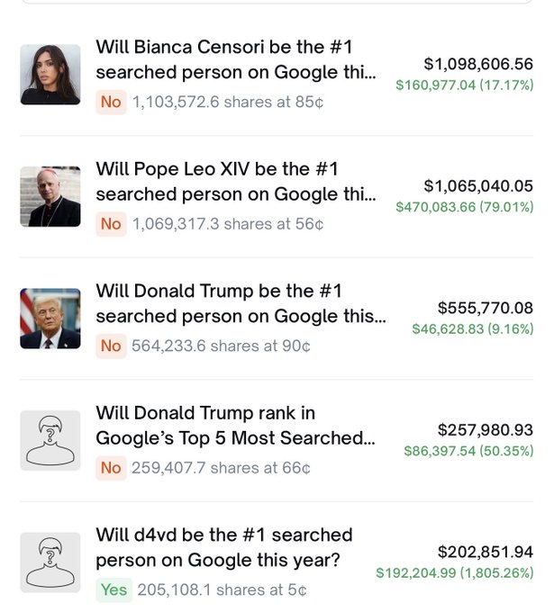 이전에 제미니(Gemini) 시장에서 10만 달러 이상을 획득한 적이 있는 무작위 계정이 모든 Google 검색 시장에서 100만 달러 이상을 획득했습니다. 선임 개발자의 급여가 두 배로 오른다? 이건 만들어낼 수 없어 ㅋㅋㅋ 계정: http:/polymarket.com/0xee50a31...…