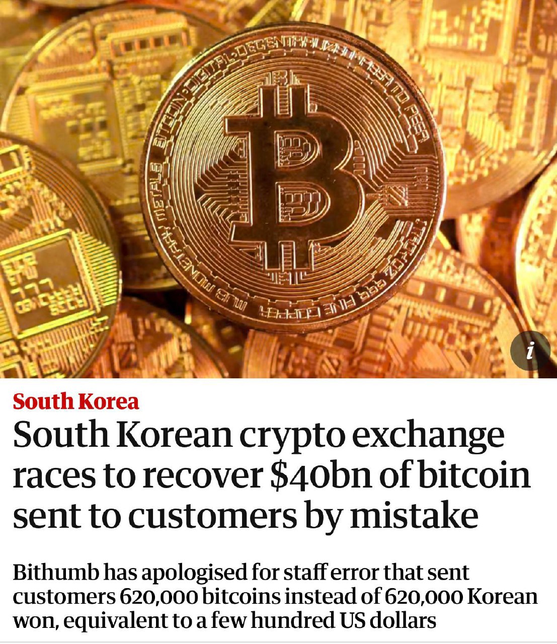 한국의 암호화폐 거래소 비썸(Bithumb)이 고객에게 잘못 전송된 약 400억 달러 상당의 비트코인을 긴급 회수했습니다.