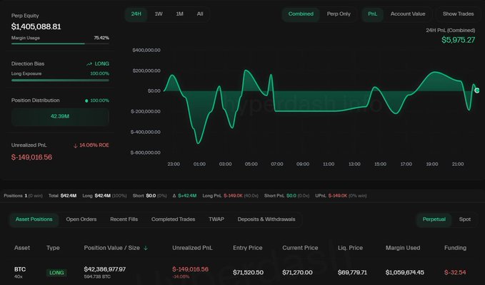 🚨 시장에 대한 엄청난 베팅: 한 고래 투자자가 40배 레버리지를 사용하여 비트코인에 대해 4230만 달러 규모의 롱 포지션을 개설했습니다. 즉, 비트코인(BTC) 2.1%만 하락해도 전체 포지션이 완전히 청산된다는 뜻입니다. 아주 작은 움직임 하나로… 4230만 달러가 날아갑니다. 👀