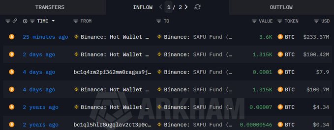 🚨속보🚨 바이낸스의 "SAFU 펀드"가 3,600개의 $BTC를 2억 3,337만 달러에 매입했습니다.