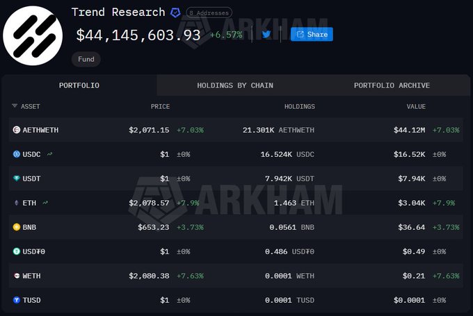 🚨잭 이의 트렌드 리서치는 평균 가격 3,267달러에 26억 달러 규모의 이더리움(ETH) 레버리지 롱 포지션을 구축했습니다. 지난주 그들은 대출금을 상환하기 위해 평균 2,326달러에 18억 달러 상당의 이더 이더리움(ETH) 매도했습니다. 현재 그들에게 남은 이더리움(ETH) 은 4400만 달러 상당이며, 총 손실액은 7억 5천만 달러에 달합니다.