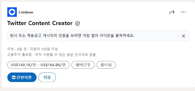 ✔️ 코인베이스 트위터 컨텐츠 크리에이터 채용 연봉 14만불주네요 관심있는 분들 한번보세요 신청하기 #Coinbase