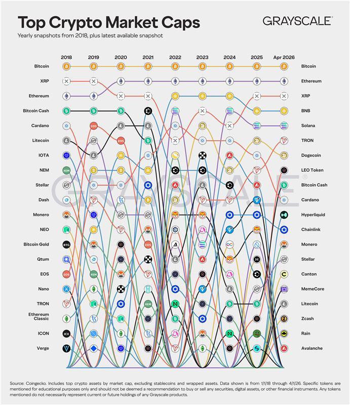 90%의 알트는 사라지는 시대, 2018년 2026년 코인 시총 비교와
