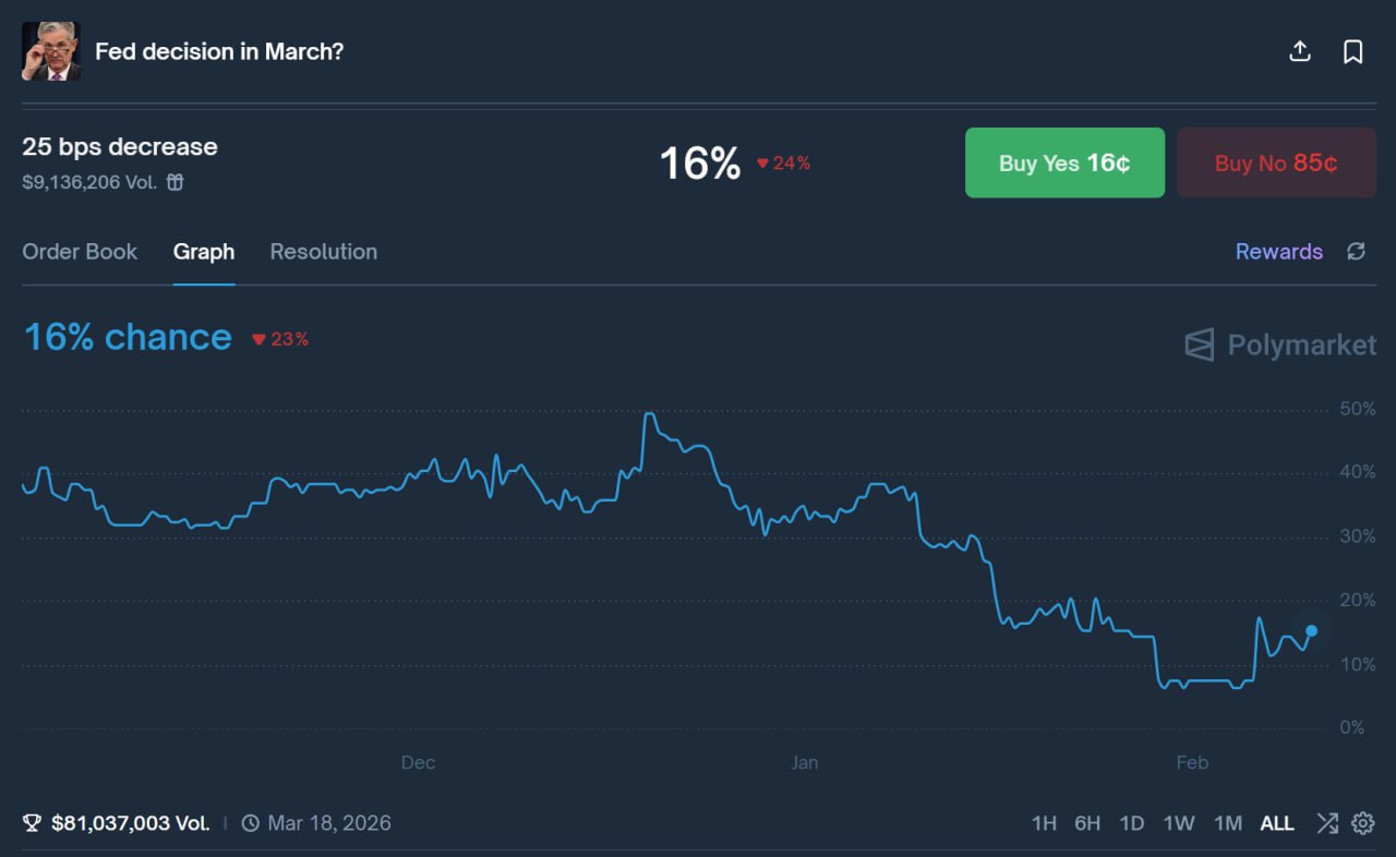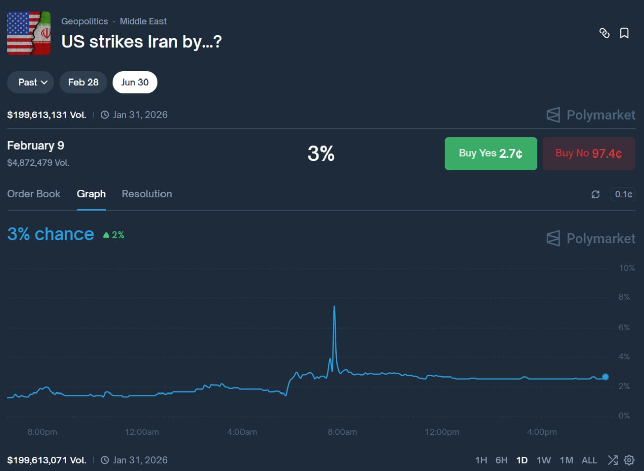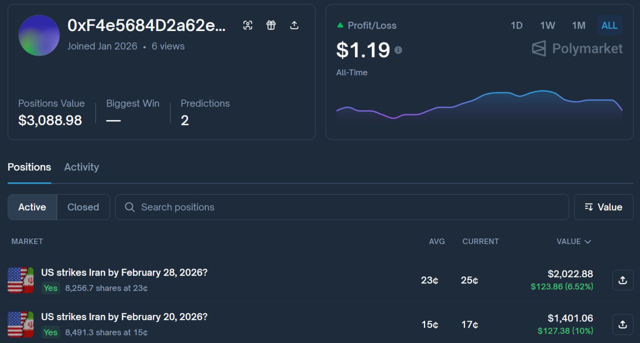 예측 시장인 폴리마켓에서 지난 12시간 동안 단 한 건의 거래 내역만 있는 한 계정이 미국이 2월 9일 이전에 이란을 공격할 것이라는 데 56,000달러를 평균 2센트의 가격으로 베팅했으며, 현재 이 베팅의 적중 확률은 3%입니다.