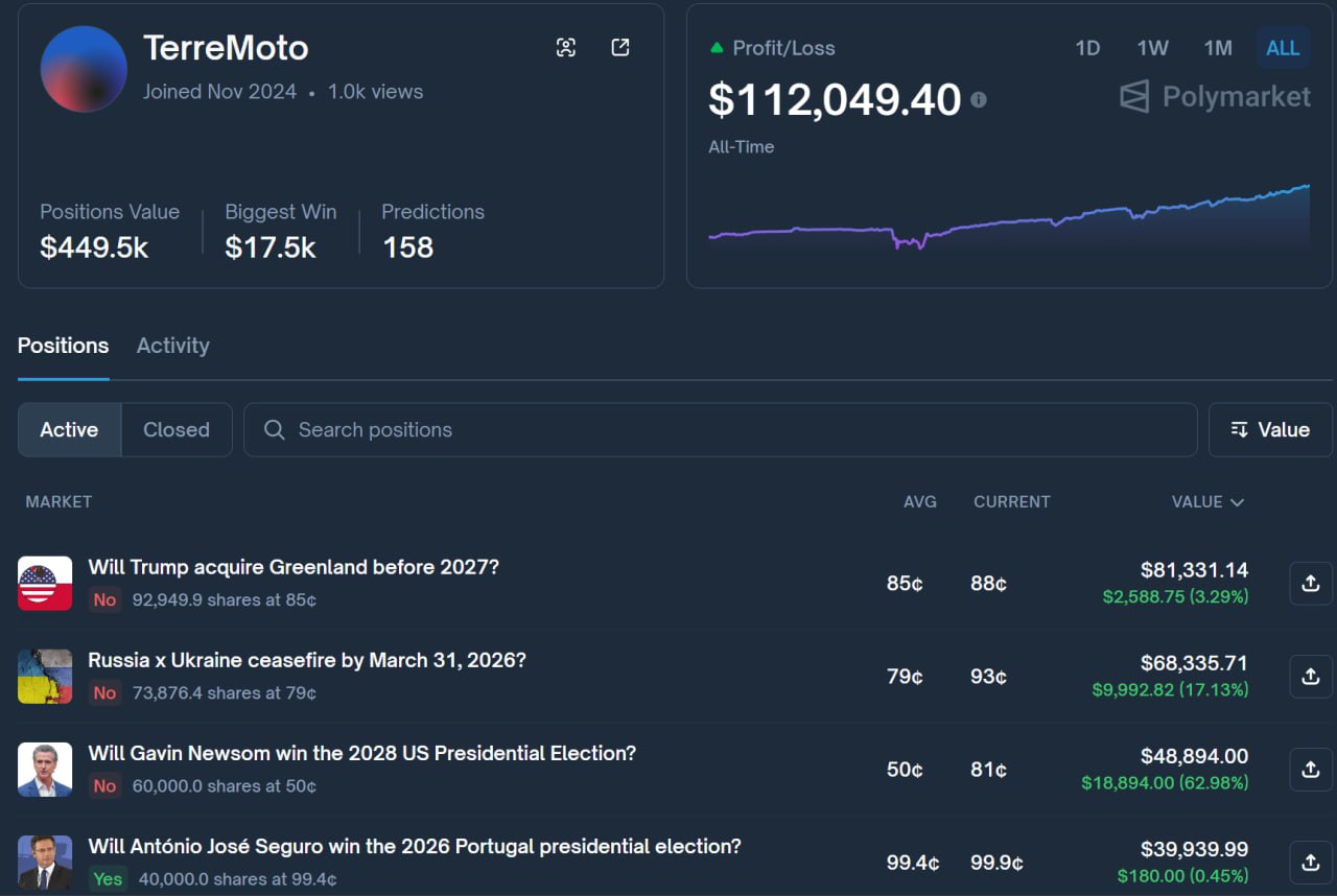 해당 계좌의 유일한 과거 거래 내역은 트럼프가 2024년 대선에서 승리하지 못할 것이라는 데 건 베팅으로, 총 7만 5천 달러의 손실을 봤습니다. 특히 주목할 만한 점은 손실 후에도 계좌에 40만 달러 이상의 잔액 남아 있었는데, 이 금액은 오늘 또 다른 베팅에 사용되기 전까지 인출되지 않았다는 것입니다.