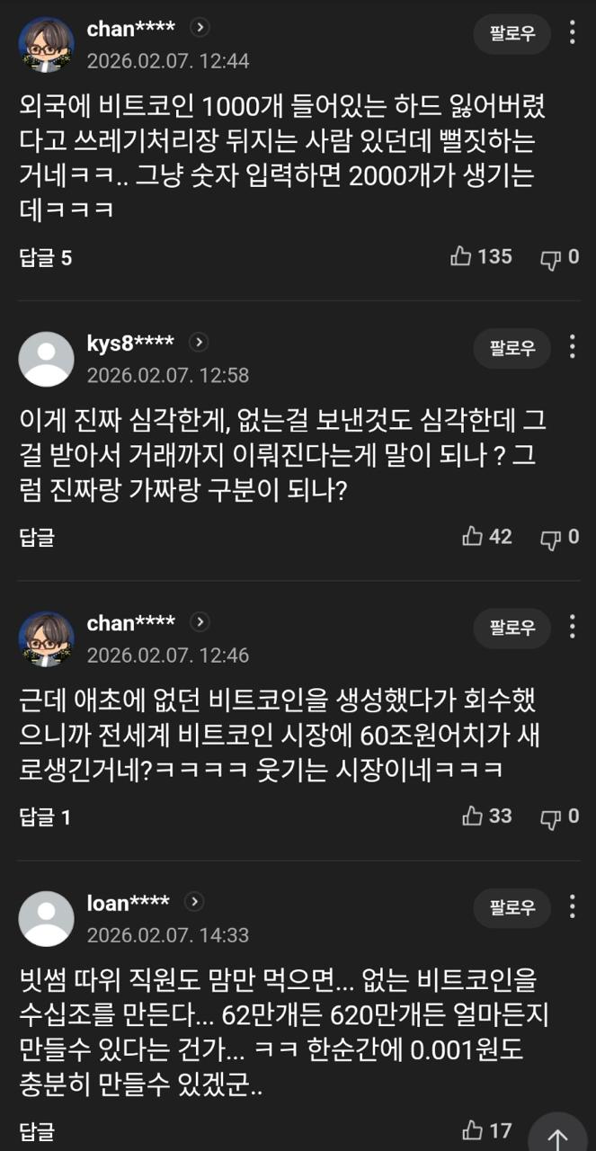 빗썸의 62만 BTC 복사? 사건이 보여주는 (Real) 비트코인의 중요성 외국에 비트코인 1000개 들어있는 하드 잃어버렸다고 쓰레기처리장 뒤지는 사람 있던데 뻘짓하는 거네ㅋㅋ.. 그냥 숫자 입력하면 2000개가 생기는데ㅋㅋㅋ kys8** (12:58) 이게 진짜 심각한게, 없는 걸 보낸 것도 심각한데 그걸 받아서 거래까지 이뤄진다는 게 말이 되나? 그럼 진짜랑 가짜랑 구분이 되나? chan** (12:46)** 근데 애초에 없던 비트코인을 생성했다가 회수했으니까 전세계 비트코인 시장에 60조원어치가 새로 생긴 거네?ㅋㅋㅋㅋ 웃기는 시장이네ㅋㅋㅋ loan** (14:33) 빗썸 따위 직원도 맘만 먹으면 없는 비트코인을 수십조를 만든다... 62만개든 620만개든 얼마든지 만들 수 있다는 건가...ㅋㅋ 한순간에 0.001원도 충분히 만들 수 있겠군.. 이번 빗썸의 ‘62만 개 비트코인 오지급’ 사건은 오히려 비트코인이 왜 만들어졌는지, 그리고 왜 여전히 중요한지를 극적으로 보여준다. 위험한 것은 비트코인이 아니라 중개자다. 거래소 계좌에 찍힌 비트코인은 진짜 비트코인(온체인에 존재하는)을 의미하지 않는다. 본질적으로 “지급 약속(IOU)” 에 가깝다. 이는 전통 금융에서 반복되어 온 구조다. 우리가 사용하는 은행 시스템 역시 실물 현금보다 훨씬 많은 숫자가 장부 위에서 움직인다. 문제는 비트코인이 아니라 중앙화된 장부를 운영하는 인간의 시스템 리스크다. 비트코인은 바로 이 문제를 해결하기 위해 만들어졌다. 예를 들어 빗썸이든 다른 거래소든 장부상에서 비트코인 100만개 찍어서 덤핑했다고 치자 그럼 비트코인이 망하는게 아니라 해당 거래소의 가짜 비트코인 가격은 0원이 되고 거래소가 망한다. (롤백하면 망하지 않겠지만 신뢰를 잃어서 망할 듯)