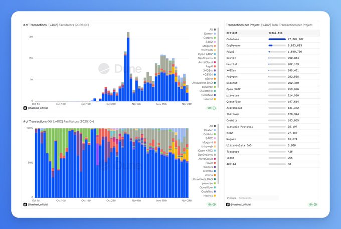 Vài tuần trước, x402 là nhân vật chính của tiền điện tử. Và bây giờ thì sao? Đã lấy dữ liệu từ bảng điều khiển @hashed_official của @Dune để các con số có thể kể một câu chuyện rõ ràng ↓ 1️⃣ TĂNG TRƯỞNG Các con số: • Ngày 2-3 tháng 11: 3 triệu giao dịch/ngày (cao điểm) • Cuối tháng 11: Ổn định ở mức 1-2 triệu mỗi ngày • Tổng khối lượng giao dịch: ~$600K-2M mỗi ngày 2️⃣ NGƯỜI HƯỚNG DẪN Sự phát triển của thị phần: • Đầu tháng 10: Dexter 100% • Cuối tháng 10: PayAI, DayDreams chiếm 40-50% vào một số ngày • Cuối tháng 11: Dexter ~40-50%, DayDreams ~20-30%, 15+ người khác chia phần còn lại 3️⃣ XÍCH Sự cố: • @base: 37,2 triệu giao dịch (95%) • @ Solana: 1,4 triệu (3,8%) • Những người khác: <300K (lỗi làm tròn) Nhưng nước đi muộn của Solana: • Giữa tháng 11: 10.000 lượt truy cập mỗi ngày • Ngày 21 tháng 11: 250K mỗi ngày (25 lần trong 10 ngày) 4️⃣ MÃ THÔNG BÁO Câu chuyện USDC : • Chuỗi Máy ảo Ethereum (EVM) : 98,6% USDC • Solana: 96,5% USDC • Mọi thứ khác (ETH, SOL, USDT): <2% 5️⃣ KÍCH THƯỚC GIAO DỊCH Thanh toán trung bình: • Máy ảo Ethereum (EVM): ~$0,90-1,00 • Solana: ~$0.60 6️⃣ KẾT LUẬN x402 trong 2 tháng: • Tổng cộng hơn 40 triệu giao dịch • 1-2M mỗi ngày (ổn định) • 95% trên cơ sở • 98,6% USDC • Thanh toán trung bình 0,60-1,00 đô la • 15+ người hướng dẫn tham gia thi đấu Bối cảnh rất rõ ràng: x402 đang trở thành lớp thanh toán cho các tác nhân AI. twitter.com/stacy_muur/status/...