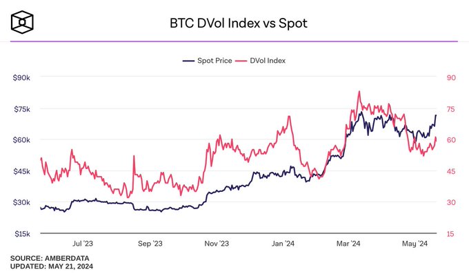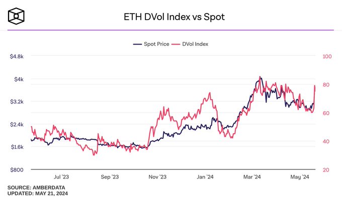 Chỉ số DVol của ETH và BTC so với giao ngay 🌊 Chưa thấy 100 vol BTC hoặc ETH kể từ tháng 11 năm 2022. ETH ETF có đưa chúng ta đến đó không??