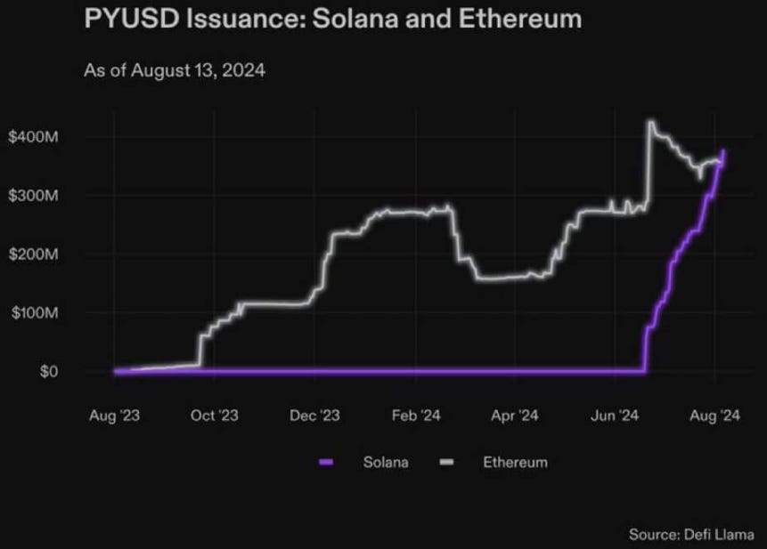 Một số đồng tiền ổn định nổi tiếng cũng đang có những động thái đáng kể vào Solana. Đồng tiền ổn định của PayPal, PYUSD, đã tích lũy được nhiều Tổng giá trị khóa (TVL) hơn trên Solana so với Ethereum trong vòng chưa đầy hai tháng kể từ khi ra mắt, nhờ vào lợi suất hấp dẫn mà nó mang lại trên Kamino.