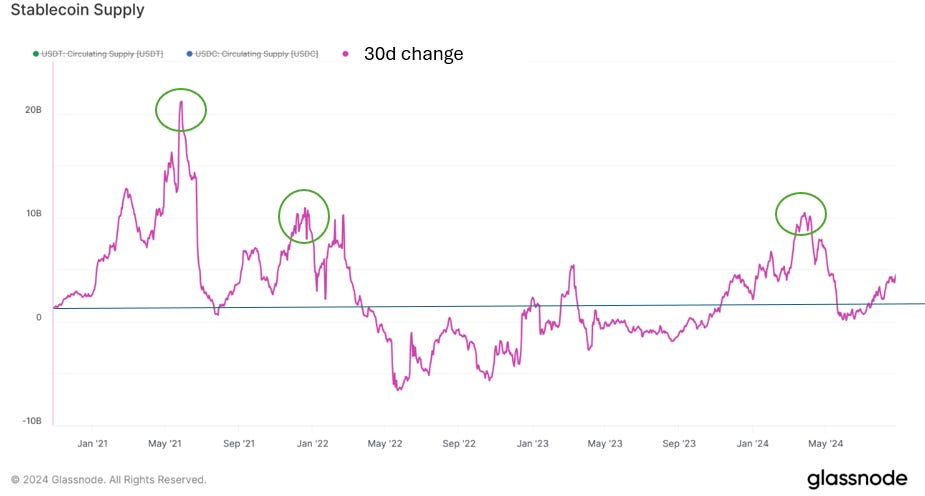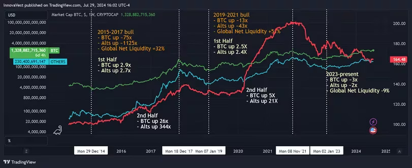 Trong phân tích của chúng tôi về hiệu suất của Alts so với BTC trong chu kỳ tiền điện tử, chúng tôi thấy rằng Alts có thể vượt trội hơn đáng kể so BTC trong nửa sau của thị trường Bull . Chúng tôi kỳ vọng giai đoạn này sẽ bắt đầu vào quý 4 năm 2024 nếu mô hình lịch sử vẫn đúng.