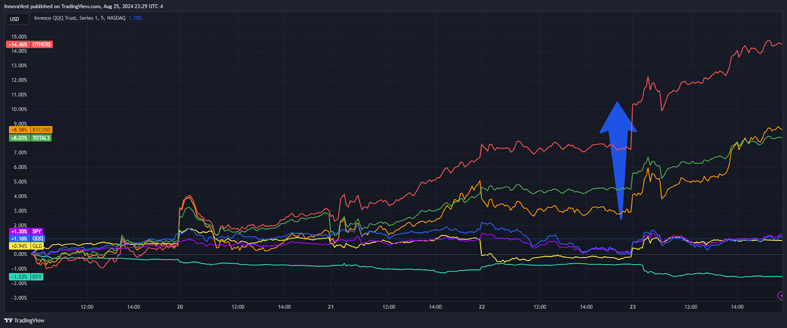 Chủ tịch Fed Powell đã gửi một tín hiệu mạnh mẽ đến thị trường về việc cắt giảm lãi suất sắp xảy ra vào tháng 7 này trong bài phát biểu tại Jackson Hole của ông. Mặc dù thị trường đã định giá ít nhất một lần cắt giảm lãi suất vào tháng 9 này trước bài phát biểu của Powell, bài phát biểu của ông đã tạo thêm niềm tin về quỹ đạo nới lỏng sắp tới. Thị trường hiện đang định giá khoảng 80% khả năng cắt giảm lãi suất ít nhất 1% vào cuối năm, tăng đáng kể so với chỉ một tuần trước.