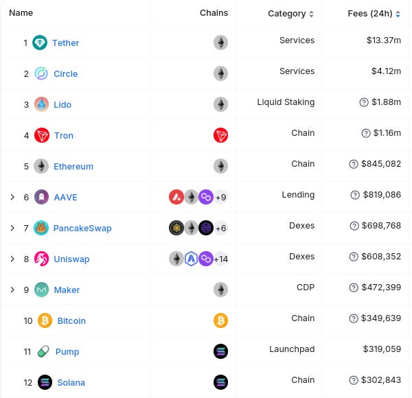 Dưới đây là 12 thực thể hàng đầu theo thế hệ phí 24 giờ (từ DefiLlama) :