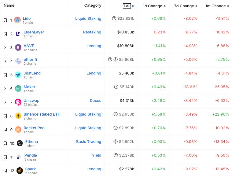 Dưới đây là 12 giao thức hàng đầu theo Tổng giá trị khóa (TVL) (từ @ DefiLlama) :
