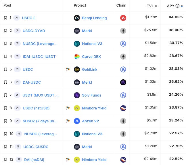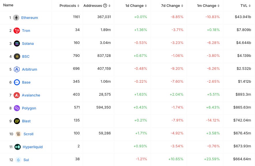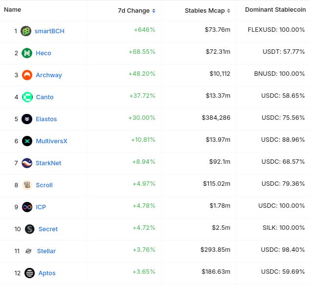 Dưới đây là 12 chuỗi hàng đầu theo % dòng tiền ổn định chảy vào trong 7 ngày (từ DefiLlama) :