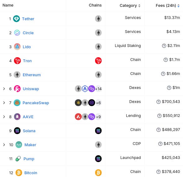 Dưới đây là 12 thực thể hàng đầu theo thế hệ phí 24 giờ (từ DefiLlama) :