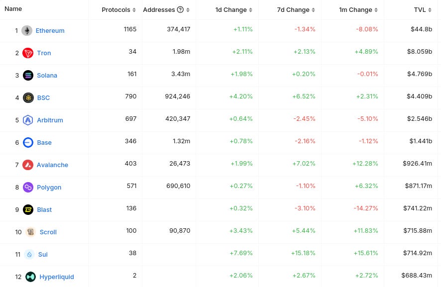Dưới đây là 12 chuỗi hàng đầu theo Tổng giá trị khóa (TVL) (từ @ DefiLlama) :