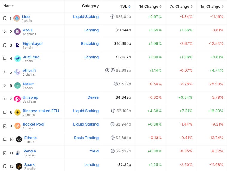 Dưới đây là 12 giao thức hàng đầu theo Tổng giá trị khóa (TVL) (từ @ DefiLlama) :