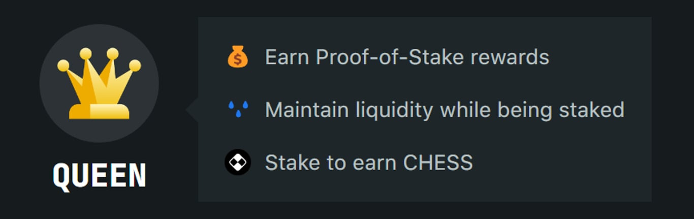 Lấy BTC làm ví dụ, người nắm giữ QUEEN không chỉ có thể tận hưởng lợi nhuận do thay đổi giá Bitcoin mang lại mà còn kiếm thêm phần thưởng token quản trị CHESS thông qua đặt cược. Nhà đầu tư có thể đổi trực tiếp BTC lấy QUEEN hoặc mua bằng USDC trong Tranches Swap .