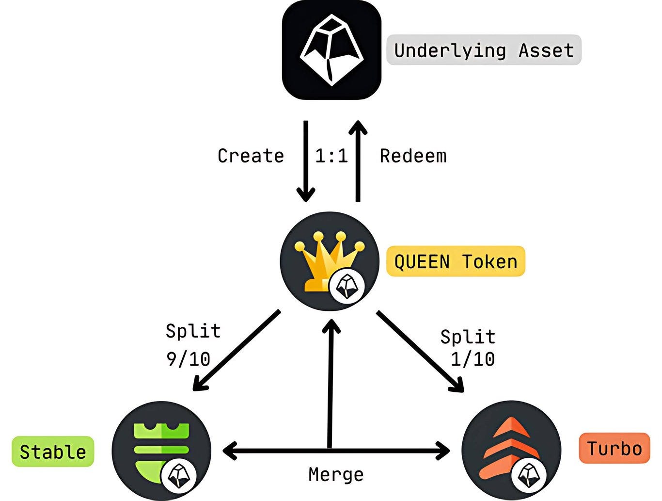 CỤC ĐÁ Cốt lõi của quỹ là cơ chế phân tách token dựa trên kiến trúc Turbo&Stable. Người dùng có thể đổi ĐÁ lấy đáQUEEN theo tỷ lệ 1:1 và mỗi đáQUEEN có thể được chia thành 0,1 turPSTONE (ĐÁ Turbo Point) và 0,9 staYSTONE (ĐÁ Năng suất ổn định). Đồng thời, quá trình này có thể đảo ngược và người dùng có thể hợp nhất 0,1 turPSTONE và 0,9 staYSTONE lại thành 1 stoneQUEEN.