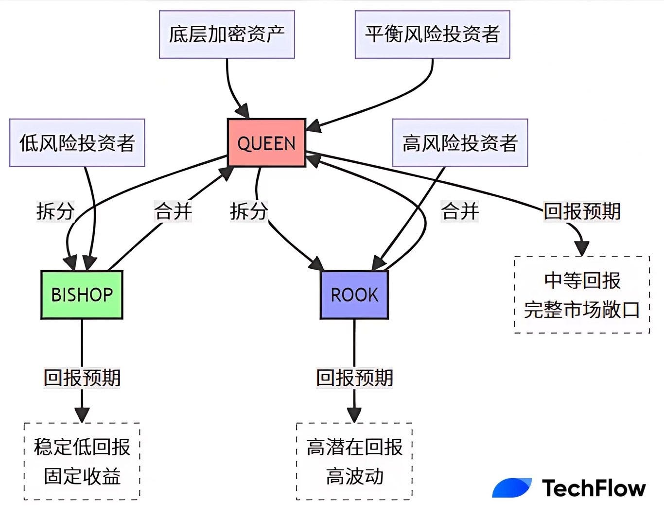 Hai token phái sinh BISHOP và ROOK được tách ra từ QUEEN thể hiện các đặc điểm rủi ro và lợi nhuận khác nhau.