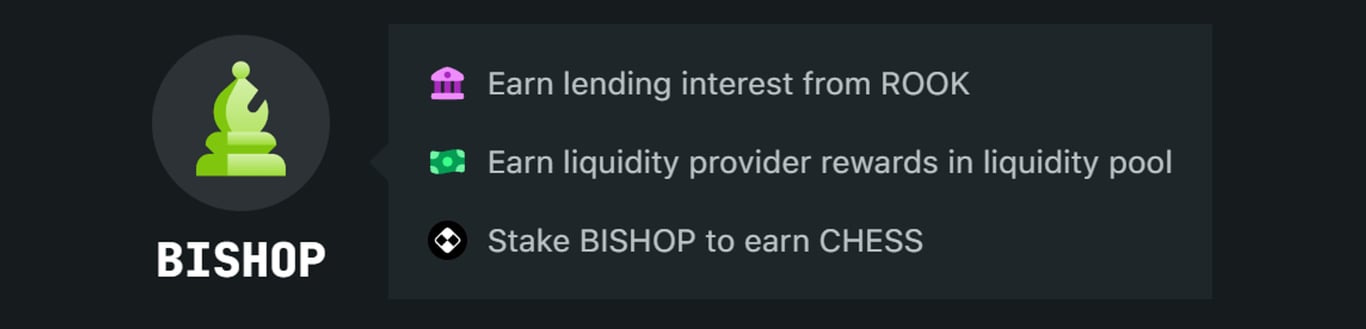 BISHOP là token lợi nhuận cố định có rủi ro thấp hơn và mang lại lợi nhuận ổn định, tương tự như các sản phẩm lợi nhuận cố định. Nguồn lợi nhuận của nó là tỷ suất lợi nhuận QUEEN cố định, được điều chỉnh định kì theo thỏa thuận dựa trên điều kiện thị trường. BISHOP mang lại lợi nhuận tương đối ổn định khi thị trường biến động và phù hợp với các nhà đầu tư không thích rủi ro.