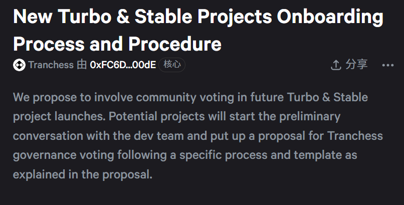 Đề án quản trị 9 được cộng đồng Tranchess thông qua gần đây đề xuất rằng trong tương lai, quyền quản trị biểu quyết của veCHESS có thể được mở rộng đến cấp ra quyết định của tất cả các dự án Turbo&Stable mới ra mắt. Đề án này tiếp tục mở rộng veCHESS cho nhiều trường hợp sử dụng hơn đồng thời chứng minh tiềm năng trong tương lai của kiến trúc Turbo&Stable trong việc nhân rộng nhanh chóng.