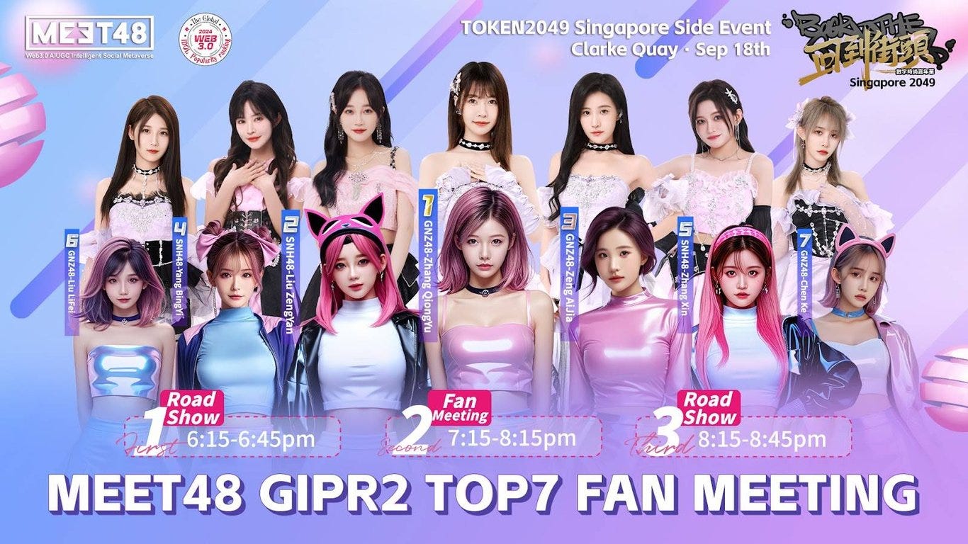 MEET48 sẽ mời 7 thành viên của SNH48 tham gia sự kiện offline của chúng tôi tại Singapore. Đồng thời, chúng tôi sẽ dần dần triển khai hệ thống phát triển thần tượng MEET48 tại Nhật Bản, Hàn Quốc, Đông Nam Á, Đài Loan và Hồng Kông, tận dụng tối đa AI để hạ thấp ngưỡng tham gia của người dùng và sử dụng cơ chế token để khích lệ ngày càng có nhiều người muốn trở thành thần tượng để thực hiện ước mơ của mình.