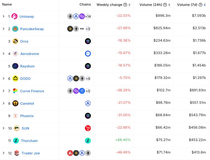Dưới đây là 12 Dex hàng đầu theo khối lượng giao dịch giao dịch trong 7 ngày (từ DefiLlama) :