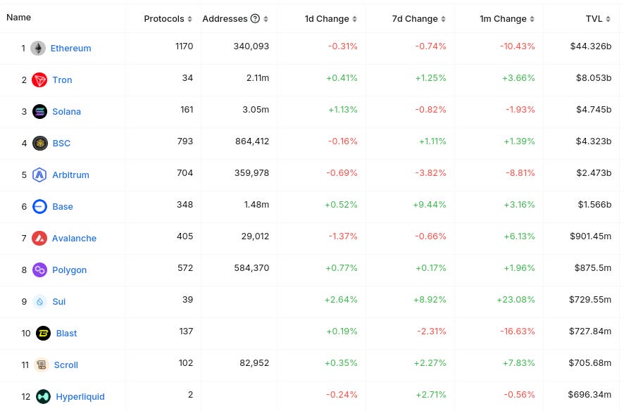 Dưới đây là 12 chuỗi hàng đầu theo Tổng giá trị khóa (TVL) (từ @ DefiLlama) :