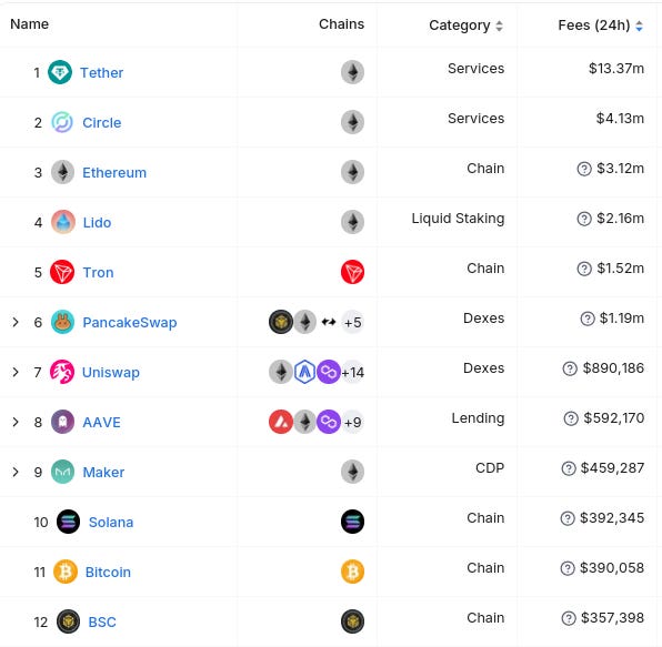 Dưới đây là 12 thực thể hàng đầu theo thế hệ phí 24 giờ (từ DefiLlama) :