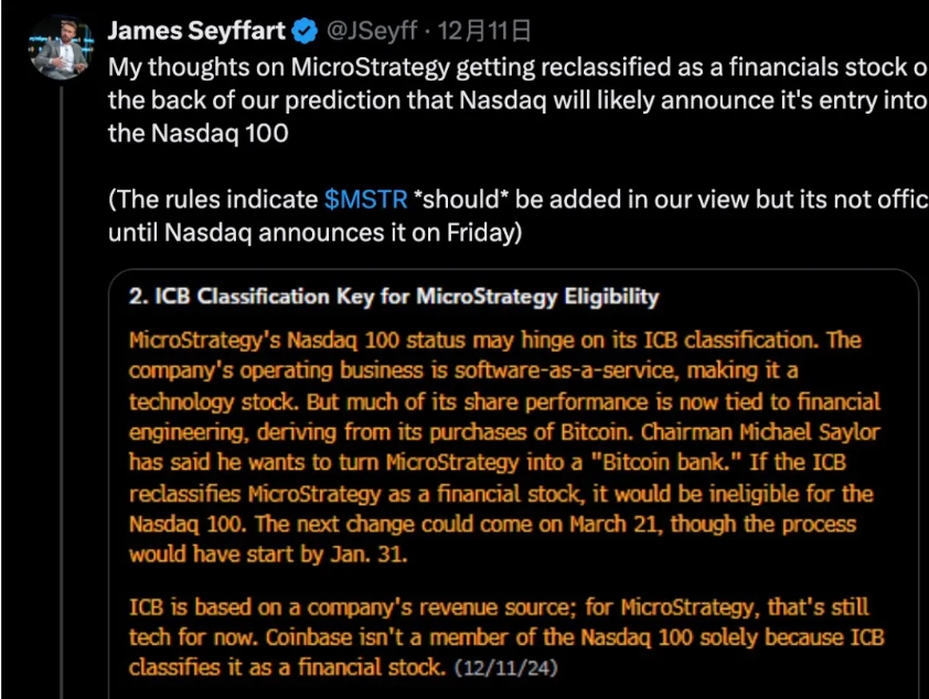 Với việc chính thức từ chối Đề án, giá BTC đã từng giảm xuống còn 94.000 USD và sau đó nhanh chóng quay trở lại. Tác động thứ hai đến từ MicroStrategy. Theo dự đoán của nhà phân tích James Seyffart của Bloomberg, việc MicroStrategy tư cách để được đưa vào Chỉ số Nasdaq 100 có thể là do được ICB phân loại là công nghệ, nhưng hướng việc kinh doanh chính hiện tại của nó khiến nó trở thành cổ phiếu tài chính bị ảnh hưởng. Nhà phân tích này đã rất tích cực trong quá trình xem xét BTC ETF vào đầu năm và đã thu hút được lượng lớn sự chú ý với tư cách là người phát ngôn cho các tổ chức và nguồn thông tin liên quan. Do đó, điều này cũng sẽ có tác động nhất định đến giá BTC trong một khoảng thời gian, vì nếu MSTR có thể được đưa vào Nasdaq thì lượng lớn các quỹ ETF chỉ số sẽ mang lại đủ thanh khoản hơn cho MSTR, được hưởng lợi từ mô hình kinh doanh của MSTR. , giá BTC cũng sẽ tăng hơn nữa.