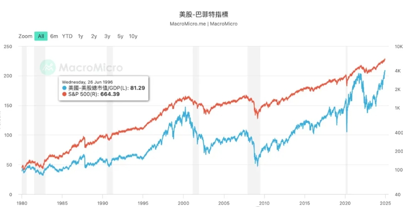 Với sự trở lại của Trump, những cắt giảm nội bộ của ông trong các chính sách của chính phủ sẽ có tác động đáng kể đến cấu trúc kinh tế Hoa Kỳ. Chúng ta hãy xem xét một dữ liệu, chỉ báo Buffett của chứng khoán Mỹ. Cái gọi là chỉ báo Buffett, thần chứng khoán Buffett đã đề cập trong một bài viết trên tạp chí Forbes tháng 12 năm 2001: Tỷ lệ tổng giá trị vốn hóa thị trường của thị trường chứng khoán trên GDP có thể được sử dụng để đánh giá xem thị trường chứng khoán tổng thể quá cao hay quá thấp , vì vậy nó thường được gọi là chỉ báo Buffett . Chỉ báo này có thể đo lường liệu thị trường tài chính hiện tại có phản ánh hợp lý các nguyên tắc cơ bản hay không. Chỉ số lý thuyết của Buffett chỉ ra rằng 75% đến 90% là một phạm vi hợp lý và hơn 120% cho thấy thị trường chứng khoán được định giá quá cao.