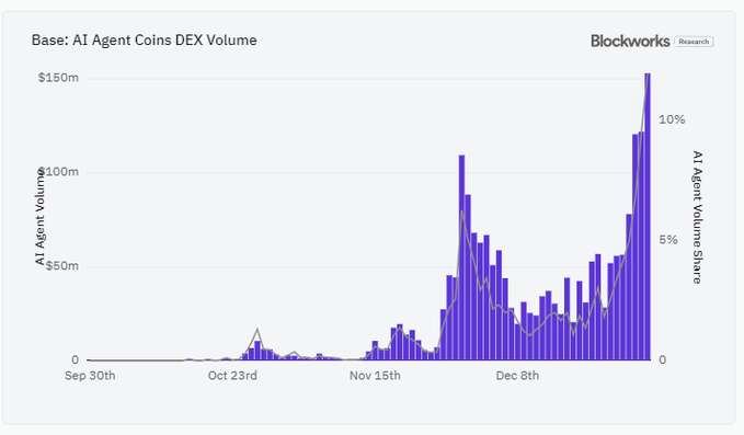 Khối lượng giao dịch trên Sàn phi tập trung (DEX) do do phát hành trên <@virtuals_io> vừa đạt mức cao nhất mọi thời đại, chiếm 12% tổng khối lượng giao dịch.