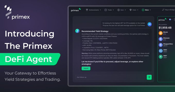 AI gặp DeFi: Giới thiệu Tác nhân DeFi của Primex 🤖 Tại Primex, chúng tôi đang đi một bước xa hơn với Tác nhân DeFi của Primex - trợ lý AI cá nhân của bạn để có các chiến lược sinh lợi và giao dịch trơn tru. Tại sao nó là Cách mạng? ✅ Tối ưu hóa #sinh lợi đơn giản với đơn giản