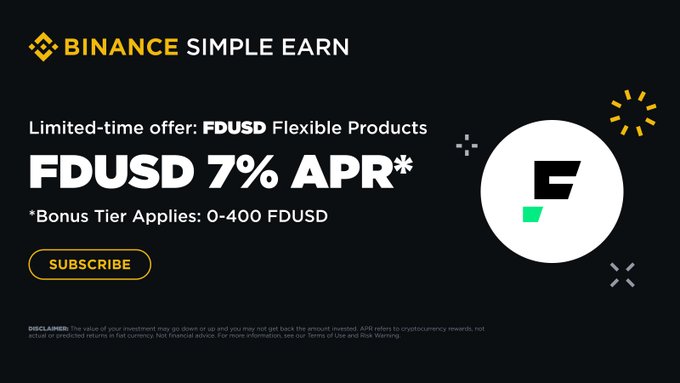 Tận dụng tối đa FDUSD của bạn với #Binance Earn! Tận hưởng Tiền thưởng Phân cấp APR 7% trên Sản phẩm Earn Đơn giản. Bắt đầu ngay 👉 <binance.com/en/support/announc...…>