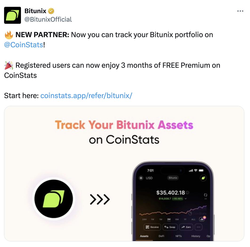 Ngoài ra, thông qua quan hệ đối tác này, người dùng Bitunix sẽ được truy cập miễn phí các tính năng cao cấp của CoinStats trong ba tháng . Gói đăng ký cao cấp này mở khóa các công cụ như sàn giao dịch và ví được kết nối không giới hạn với tối đa 1 triệu giao dịch được theo dõi, cảnh báo tự động, phân tích danh mục đầu tư chi tiết hơn, v.v. CoinStats đảm bảo rằng người dùng có thể dễ dàng theo dõi tài sản tiền điện tử của mình ở một nơi. Giao diện và khả năng phân tích tiên tiến khiến đây trở thành giải pháp được các nhà đầu tư lựa chọn để cải thiện việc quản lý danh mục đầu tư.