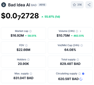 AI-based memecoin $BAD (Bad Idea AI) dẫn đầu danh mục memecoin dựa trên AI với mức tăng giá 24 giờ cao nhất. #BADIDEAAI hiện đang giao dịch ở mức $0.0000000278, $BAD đã tăng 55% với sự gia tăng khối lượng giao dịch trên 450%. 🚀 Điều gì có thể kích thích sự tăng này? #AI #memecoins #Crypto