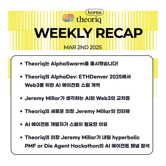 🟡 @TheoriqAI_Korea Bản tóm tắt tuần thứ tư tháng 2 ✔️ @TheoriqAI đã ra mắt AlphaSwarm! ✔️ AlphaDev của Theoriq: Khai phá Swarm AI Agent cho Web3 tại ETHDenver 2025 ✔️ Giao điểm giữa AI và Web3 theo quan điểm của Jeremy Millar ✔️ Phỏng vấn Chủ tịch mới của Theoriq, Jeremy Millar
