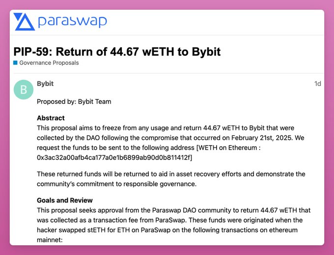Bybit yêu cầu hoàn trả 44,67 ETH từ Tổ chức tự trị phi tập trung (DAO) Paraswap mà hacker của Bybit đã thanh toán trong SWAP FEES. Quyết định này có trách nhiệm đạo đức và pháp lý đối với DAO và đặt ra tiền lệ cho hệ sinh thái DeFi rộng hơn (đáng chú ý là Thorswap). Tôi là đại biểu của Paraswap DAO nhưng vẫn chia rẽ về