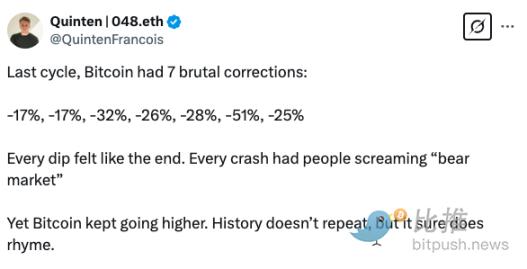 Quinten đăng bài trên nền tảng X rằng: Nhìn lại lịch sử, có thể sẽ mang lại một số bài học cho chúng ta. Trong chu kỳ bò trước đây, BTC đã trải qua bảy lần điều chỉnh lớn, với mức giảm lần lượt là: -17%, -17%, -32%, -26%, -28%, -51%, -25%. Mỗi lần điều chỉnh đều gây ra tâm lý hoảng loạn trên thị trường, khiến mọi người cảm thấy 'thị trường gấu' đã đến. Mỗi khi giá giảm mạnh, thị trường luôn đầy những lời tuyên bố 'Bitcoin đã chết'. Tuy nhiên, lịch sử đã chứng minh, BTC cuối cùng đều vượt qua được các điểm cản và tiếp tục tăng. Tất nhiên, lịch sử không thể đơn giản lặp lại, nhưng thường sẽ tương tự một cách đáng kinh ngạc.