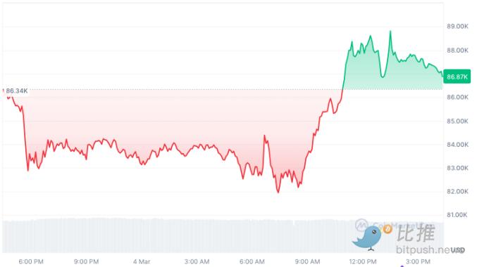 Dữ liệu của Bitpush cho thấy, trong 24 giờ qua, Bitcoin (BTC) đã tăng từ mức thấp nhất trong ngày là 81.500 USD lên trên 88.000 USD, tăng gần 10% trong ngày. Đồng thời, ba chỉ số chính cũng thu hẹp mức giảm, với Nasdaq giảm 0,35% tại phiên đóng cửa.