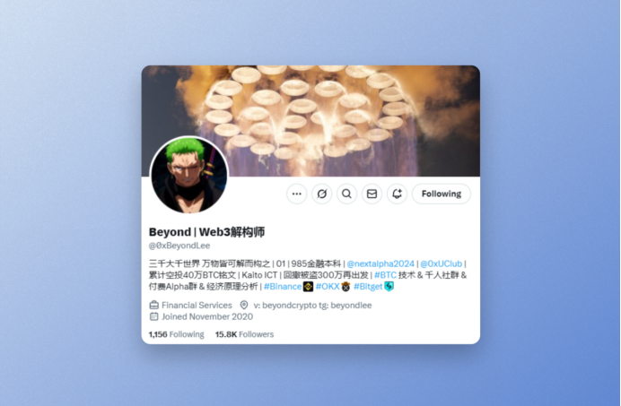 Xin chào mọi người, tôi là Beyond, sinh năm 2000, là người sáng lập NextAlphaDAO, hiện đang vận hành tài khoản Twitter và cộng đồng của riêng mình. Tôi đã chính thức gia nhập lĩnh vực này được khoảng 2,5 năm, lợi nhuận cao nhất đạt 4 triệu NDT, tính đến nay tài sản cá nhân của tôi đã tăng gấp 15 lần.