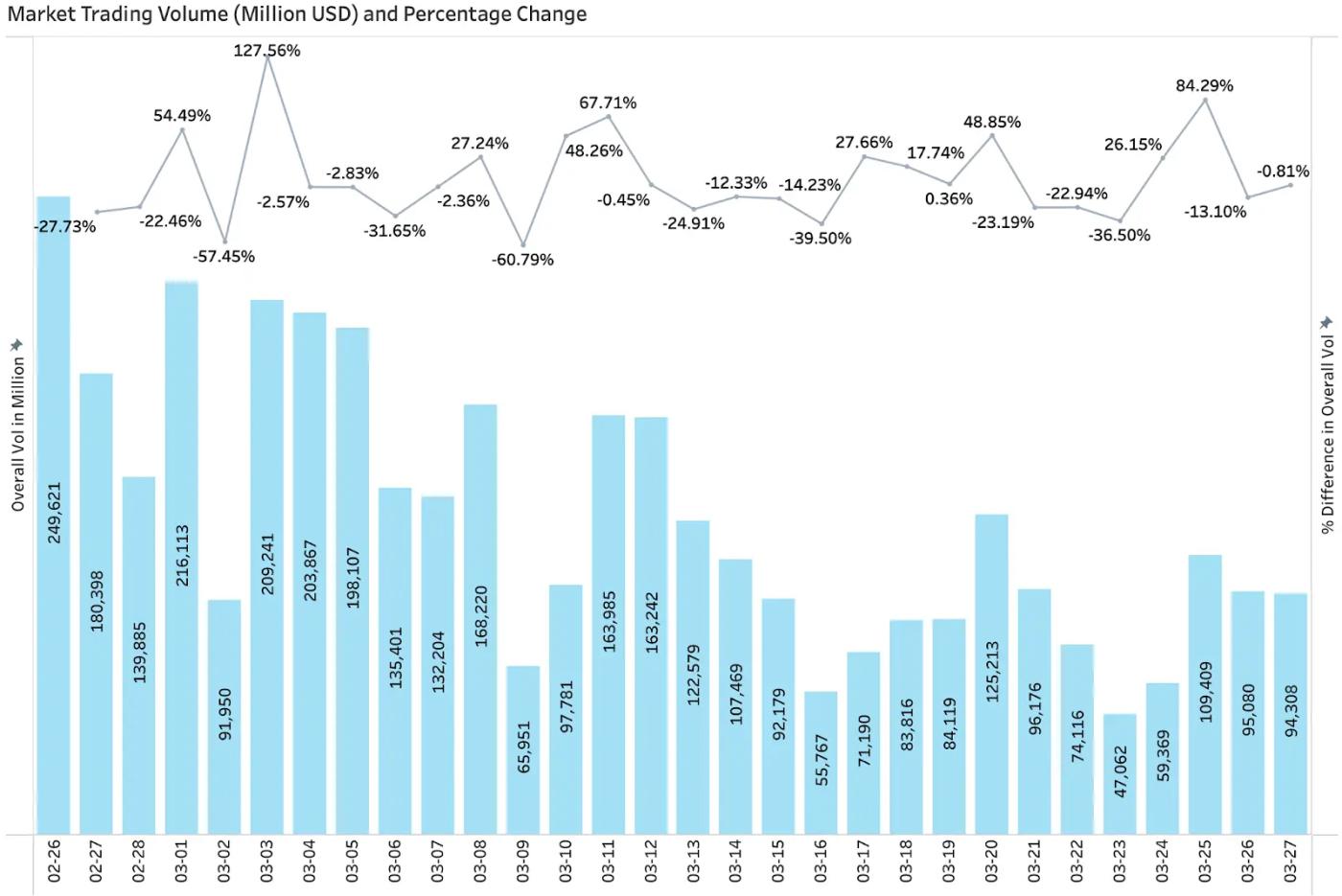 Theo dữ liệu của CoinGecko, tính đến ngày 27 tháng 3, tổng khối lượng giao dịch hàng ngày của thị trường crypto có xu hướng giảm và hoạt động thị trường tiếp tục suy yếu. Khối lượng giao dịch trung bình hàng ngày hiện tại là 124,5 tỷ đô la Mỹ, giảm 12% so với chu kỳ trước. Có một dòng tiền chảy vào ngắn hạn vào ngày 20 tháng 3, thúc đẩy khối lượng giao dịch phục hồi, nhưng không tạo được đà tăng trưởng bền vững và khối lượng giao dịch thị trường sau đó vẫn ở mức thấp.