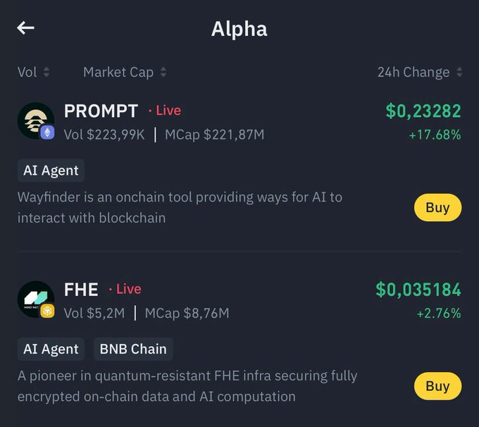 🚨VỪA XONG: #Binance Thông Báo Danh Sách Dự Án Spotlight Lần Thứ 38 trên Binance Alpha $PROMPT (@AIWayfinder) và $FHE (@mindnetwork_xyz) đã được chọn là dự án Spotlight thứ 38 của Binance.