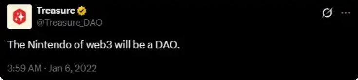 Vào ngày 6 tháng 1 năm 2022, twitter chính thức TreasureDAO đã đưa ra tuyên bố táo bạo: “Nintendo của Web3 sẽ là một DAO.”