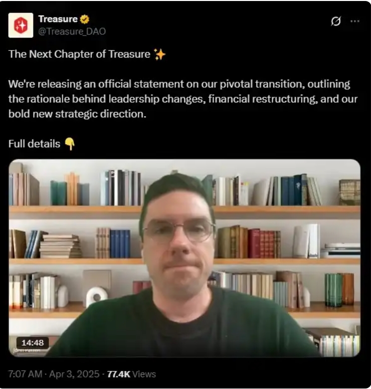 Vào ngày 3 tháng 4 năm 2025, TreasureDAO đã phát hành video dài gần 15 phút có tựa đề "Chương tiếp theo của TreasureDAO", thông báo quyết định chấm dứt hoàn toàn hoạt động phát hành trò chơi và phân phối trò chơi và chuyển sang AI.