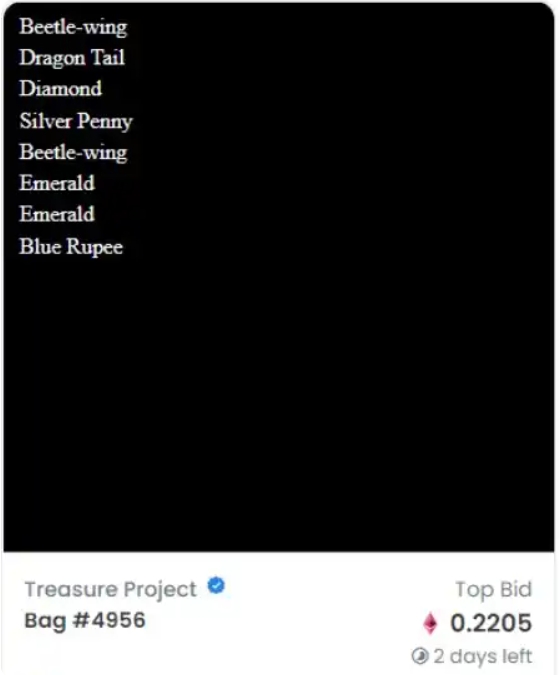 Lấy cảm hứng từ Loot, John Patten và yyyy cho rằng vì việc tạo ngẫu nhiên NFT từ tên vũ khí và trang bị là một ý tưởng tuyệt vời, thì việc tạo ngẫu nhiên NFT từ tên của các vật liệu kho báu phổ biến trong các trò chơi nhập vai như "kim cương" và "ngọc bích" chẳng phải cũng rất thú vị sao? Và thế là “Túi kho báu” dưới đây đã ra đời.