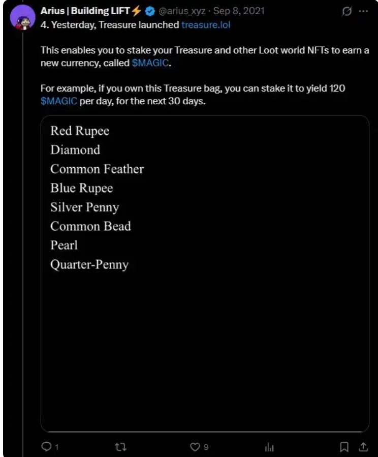 Theo dòng tweet được đăng bởi @arius_xyz vào ngày 8 tháng 9 năm 2021, việc đặt cược NFT "Treasure Bag" có thể nhận được 3.600 $MAGIC trong vòng 30 ngày. Giá cao nhất lịch sử của $MAGIC là 6 đô la Mỹ, điều đó có nghĩa là nếu bạn thế chấp một NFT "Treasure Bag" trong 30 ngày, giá trị của nó sẽ tăng lên 21.600 đô la Mỹ sau nửa năm.